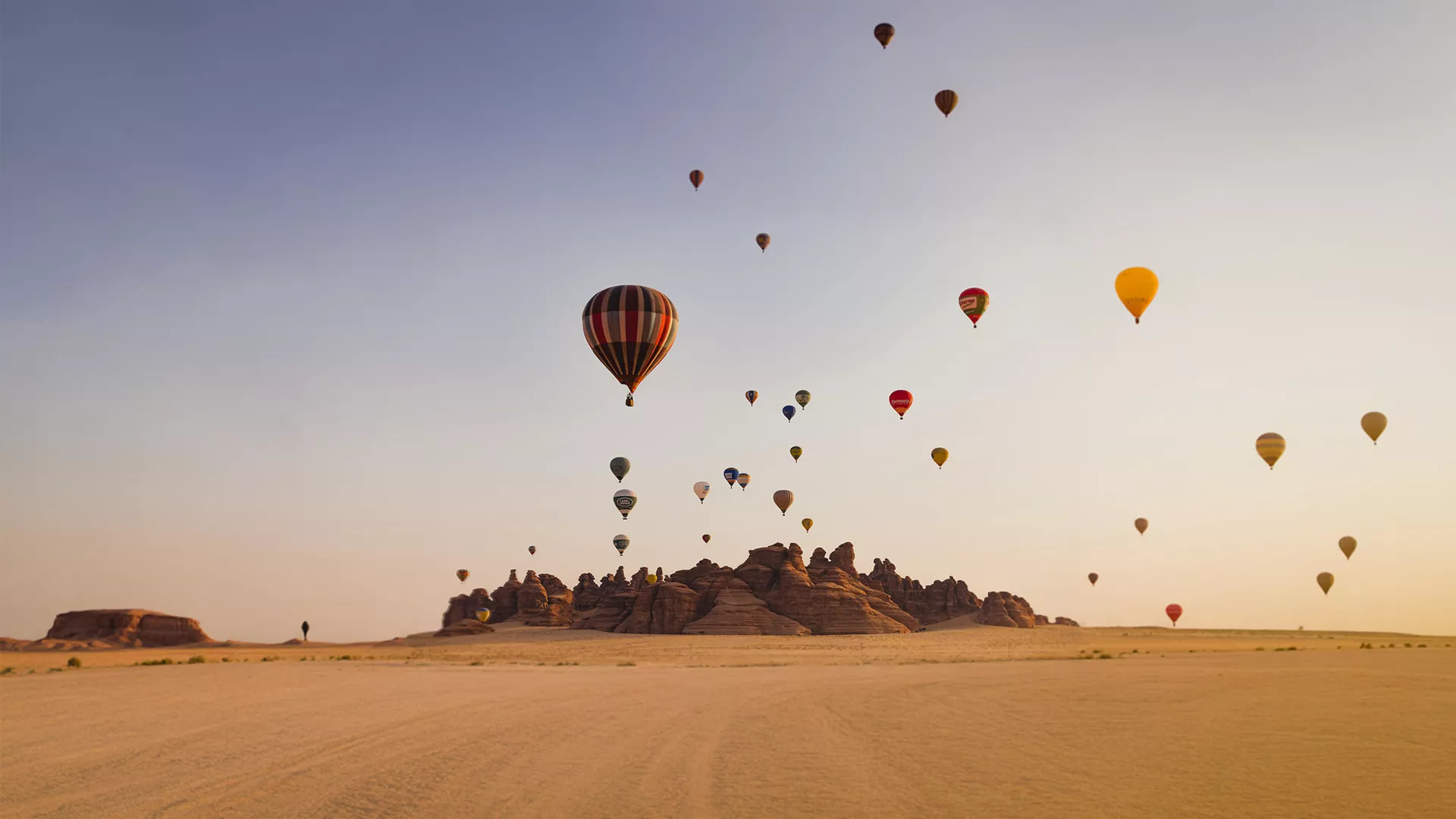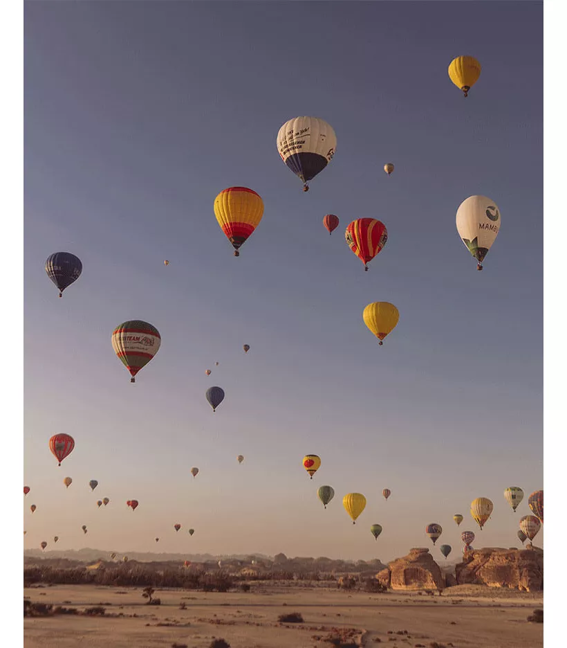 تأمّل سحر المناظر الطبيعية والمعالم التاريخية من سماء العلا مع رحلة تجمع 30 منطاداً فوق الحِجر في سكون الأجواء الصباحية.