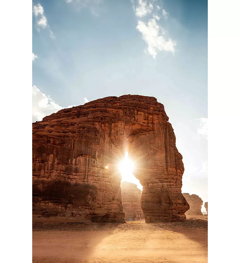 فوق رمال العلا الواسعة، وبين تكويناتها الصخرية الشاهقة، تبدأ رحلتنا على ظهور الخيل العربية الأصيلة باتجاه جبل الفيل الشهير.
